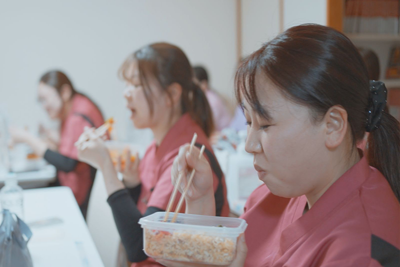 お弁当を囲みながら、仕事やプライベートの話で盛り上がっています。