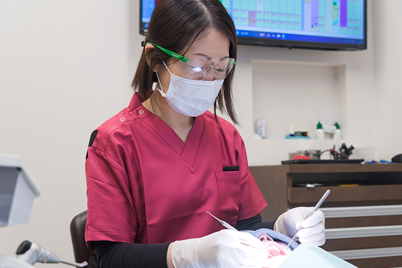 衛生士専用ユニットで、歯のクリーニングや歯周病のメンテナンス、先生の手が空いてない時の急患の初診対応などもしています。